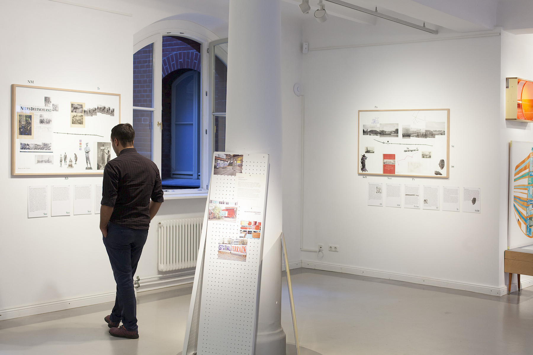 Die Präsentation “Aufmarschwege” ist die Fortsetzung des Werkkomplexes “Löwen & Adler.” Sie zeichnet die ideologische Darstellung des Wiederaufbaus in Ost Berlin als gesellschaftliche Aufgabe nach, in der der städtebauliche Aufbau eng verknüpft wurde mit der politischen Utopie, den neuen Menschen und das neue Deutschland zu konstruieren. Die Präsentation besteht aus drei Bildmontagen und der Foto-Installation “Erhebende Gesten.” Vierzehn Texttafeln geben Information über die Themen der Installation.
