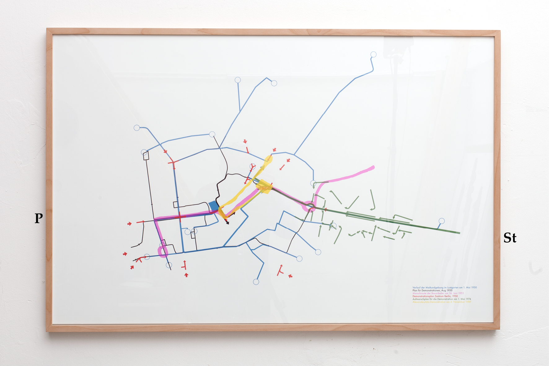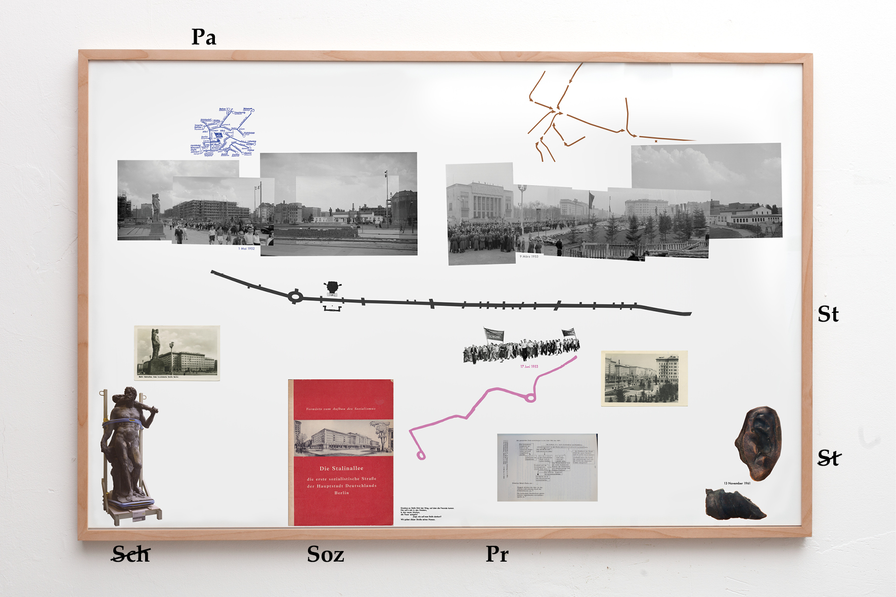 “Heraus aus den Trümmern” uses propaganda images, which promoted the clearing of rubble as a collective mission and individual duty. “Die eerste sozialistische Straße der Hauptstadt Deutschlands Berlin” revolves around the construction of the Stalinallee, which was the first prominent city planning project in East Berlin. “Aufmarschwege” shows the parade routes for the mass demonstrations of the working classes that were held between 1946 and 1974. “Erhebende Gesten” collects the statues that were installed in East Berlin between 1952 and 1985. In their poses and gestures, the statues show the pathos of the socialist utopia of the New Man.